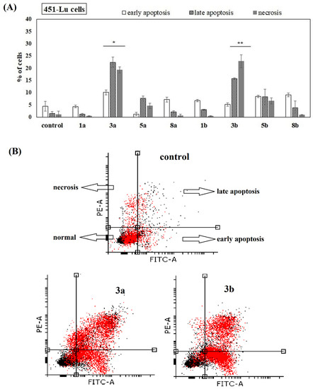 Induction of apoptosis in 451-Lu cells in the presence of the studied compounds. Cells were cultured for 72 h in the presence of the studied chemicals (at 100 µM). The percentage of necrotic, early and late apoptotic cells was shown. The statistical significance was determined (* p < 0.05 and ** p < 0.001) (A). Representative histograms of events defined after forward and side scatters as cells (red dots) and debris (black dots) are shown (B).