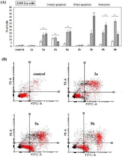 Induction of apoptosis in 1205-Lu cells in the presence of the studied compounds. Cells were cultured for 72 h in the presence of the studied chemicals (at 100 µM). The percentage of necrotic, early and late apoptotic cells was shown. The statistical significance was determined (* p < 0.05 and ** p < 0.001) (A). Representative histograms of events defined after forward and side scatters as cells (red dots) and debris (black dots) are shown (B).