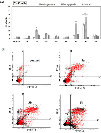 Induction of apoptosis in Me45 cells in the presence of the studied compounds. Cells were cultured for 72 h in the presence of the studied chemicals (at 100 µM). The percentage of necrotic, early and late apoptotic cells was shown. The statistical significance was determined (* p < 0.05 and ** p < 0.001) (A). Representative histograms of events defined after forward and side scatters as cells (red dots) and debris (black dots) are shown (B).