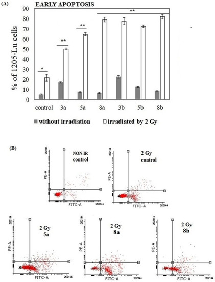 Pro-apoptotic effects of the conjugates after 48 h of incubation were weaker than after 72 h. The highest fractions of cells in the early stage of apoptosis, ~17% and ~22%, were noted in the presence of 3a and 3b derivatives, respectively (Figure 9). The amounts of cells undergoing the later steps of programmed cell death or necrosis were negligible (data not shown). Irradiation of 1205-Lu cells resulted in the increase in early apoptotic but not late apoptotic and necrotic cell fractions. Such an increase was recorded both in the untreated control and in conjugate-treated samples. However, the pre-treatment of cells with the derivatives of phenolic acids before irradiation caused more significant changes in the number of apoptotic cells. In the presence of most compounds, the percentage of apoptotic 1205-Lu cells was over 70%. The most effective combinations included ionizing radiation and the conjugates containing phenolic acid at the sn-1 position (8a and 8b) (Figure 9).