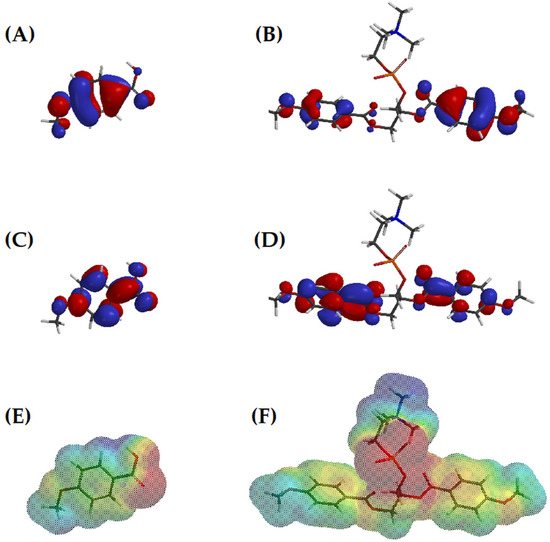 Further analysis prompted us to look at the spatial orientation of HOMO and LUMO orbitals in the molecules of phenolic acids and their conjugates. As can be seen in Figure 10, in the ANISA molecule, HOMO orbitals were concentrated mainly at its aromatic ring, while LUMO orbitals were found around the chemical bonds directly attached to the ring. The process of conjugation of phenolic acid to PC did not affect much the distribution of HOMO and LUMO orbitals. As shown in the example of the 3a conjugate, HOMO and LUMO orbitals remained at the phenolic acid fragments of the conjugate. The examination of the electrostatic potential map of 1a (Figure 10E) revealed that the highest negative potential was observed near O atoms from an acid group, while H atoms of the same group, as well as the CH3 group at the side chain, remained the centers of positive potential. The conjugation of ANISA to PC dramatically changed the appearance of the electrostatic potential map (Figure 10F). The most negative region of the molecule was now centered near the P atom and the most positive region was close to the N atom. The most peripheral CH3 groups also possessed slightly positive potential.