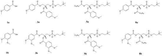 Studied conjugates of phospholipids and methoxy derivatives of benzoic acid: p-anisic acid (ANISA; 1a), 1,2-dianisoyl-sn-glycero-3-phosphocholine (3a), 1-palmitoyl-2-anisoyl-sn-glycero-3-phosphocholine (5a), 1-anisoyl-2-palmitoyl-sn-glycero-3-phosphocholine (8a), veratric acid (VA; 1b), 1,2-diveratroyl-sn-glycero-3-phosphocholine (3b), 1-palmitoyl-2-veratroyl-sn-glycero-3-phosphocholine (5b) and 1-veratroyl-2-palmitoyl-sn-glycero-3-phosphocholine (8b).