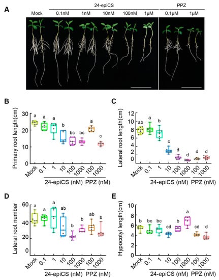 - Singh, A.P.; Fridman, Y.; Friedlander-Shani, L.; Tarkowska, D.; Strnad, M.; Savaldi-Goldstein, S. Activity of the brassinosteroid transcription factors BRASSINAZOLE RESISTANT1 and BRASSINOSTEROID INSENSITIVE1-ETHYL METHANESULFONATE-SUPPRESSOR1/BRASSINAZOLE RESISTANT2 blocks developmental reprogramming in response to low phosphate availability. Plant. Physiol. 2014, 166, 678–688. [Google Scholar] [CrossRef] [Green Version]