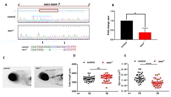 The zebrafish sacs gene (ENSDARG00000091042.4), which maps to chromosome 15, consists of 9 coding exons, and encodes a 4578 amino acid molecular chaperone protein. Previously, a bioinformatic analysis revealed that sacsin is conserved in vertebrates []. Notably, however, one homologous sequence of sacs can be found in zebrafish on chromosome 9 (predictive si:dkeyp-118h9.7: transcript ID ENSDART00000162761.2). This variant, which, for simplicity, we will call sacs2, is probably the result of a whole genome duplication event that occurred during teleost fish evolution, and it implies that in zebrafish, the specific functions of sacsin could be divided between the two duplicated genes, or simply lost or disrupted for one of them. Performing an in-silico analysis of the amino acid sequence of sacsin in Danio rerio (both sacs and sacs2), Homo sapiens, and Mus musculus, we observed high conservation of the human protein in the zebrafish sacs (70% conservation, 35% identity) but not in the sacs2 form (32% conservation, 24% identity) (Supplementary Materials Figure S1), which suggests that sacs is actually the fish ortholog of the human protein. Thus, by means of CRISPR/Cas9 editing, we engineered sacs-null mutants that generated a 10-bp deletion mutation in exon 7 of the sacs gene leading to a frameshift mutation and premature stop codon at residue 495 (R487Kfs*495) (Figure 1A), expected to disrupt the structure of sacsin near the N-terminus. The homozygous sacs−/− F2 zebrafish mutant line was raised to adulthood and its progeny (F3) were used to investigate the phenotype of the mutant strain and determine whether it replicates the features of ARSACS. Due to the lack of a reliable antibody for zebrafish, it was not possible to test the protein abundance in the mutant zebrafish by Western blotting. However, qRT-PCR analysis showed a notable decrease in the amount of sacs transcript [] in mutants compared with control (wild-type) siblings at 120 hpf (Figure 1B). The homozygous sacs mutant zebrafish larvae at 120 hpf showed slight “microphthalmia” (Figure 1C–E).