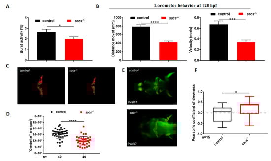 Impaired motor coordination is a clinical hallmark of ARSACS in children. The transgenic Sacs−/− mouse model displays ataxia-like motor impairment as well as PC death []. We analyzed the locomotor behavior of sacs-null (sacs−/−) mutant zebrafish larvae. Zebrafish embryos develop rapidly and show their first spontaneous movement (slow, alternating tail flicks) at approximately 17 hpf []. Analysis of tail flicks at 30 hpf in sacs−/− embryos showed a significant decrease in burst activity (i.e., the percentage of time an embryo is moving) compared with controls (Figure 2A). At 120 hpf, video tracking data revealed significantly reduced locomotor activity of sacs−/− larvae compared with control siblings, with the mutant larvae showing less movement in terms of both velocity and distance covered (Figure 2B, Supplementary Materials Video S1). To explore the nature of this motor deficit, we investigated the morphology of spinal motor neurons using the motor axon marker syt2. Immunolabeling of spinal motor neuron axons in 48 hpf mutant and control embryos showed no alterations in axon outgrowth or arborization, and no reduction of axon length (Supplementary Materials Figure S1). Acetylated α-tubulin staining confirmed the absence of motor and sensory neuron abnormalities (Supplementary Materials Figure S1). In addition, birefringence assay showed no muscle structure or compaction abnormality (Supplementary Materials Figure S1). A common feature of ARSACS is the presence of upper cerebellar vermis atrophy evolving into cerebellar hemisphere atrophy as the disease progresses, and it is observed on human brain imaging and post-mortem studies, with accompanying increased PC death []. The vertebrate cerebellum is responsible for coordinating body posture, balance, and locomotor control. The cytoarchitecture and connectivity of cerebellar neurons are highly conserved between teleosts and mammals [], and several studies have shown that the “cerebellum” of zebrafish larvae plays a functional role relating to motor coordination, adaptation, and learning []. This larval “cerebellum” lends itself to study of the physiology and function of PCs [,,], which in zebrafish develop fast, first emerging at 56 hpf, and then increasing in number until 7 dpf []. To test PCs in sacs−/−, we created a null line in the genetic background of a stable transgenic strain: Tg(tagRFP-T:PC:GCaMP5G). The latter, due to a PC-specific enhancer element, makes it possible to visualize PCs in vivo []. At 120 hpf, sacs−/− larvae displayed a significant reduction in the “cerebellar” area (Figure 2C,D); immunodetection of the calcium (Ca2+) ion-binding protein pvalb7 produced a similar finding (Figure 2E), i.e., suggesting a reduction in the number of PCs. In the cerebellum of adult mice, Pvalb is expressed in PCs and molecular layer interneurons; instead, the zebrafish form, pvalb7, is expressed in PC dendrites, soma, and axons [], and used to monitor hindbrain and optic tectum development accounting for cerebellar size and morphology.