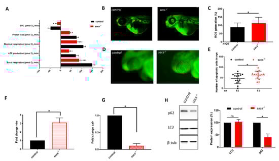 Sacs−/− mutant zebrafish manifest mitochondrial and autophagic dysfunction and ROS accumulation. (A) Mitochondrial respiratory analysis of controls (n = 30) and sacs−/− mutant larvae (n = 37) at 120 hpf. * p ≤ 0.05, ** p ≤ 0.01, **** p ≤ 0.0001, calculated by the Mann-Whitney test. (B) Representative fluorescence images of ROS generation in zebrafish larvae at 48 hpf. (C) Quantitative analysis of ROS generation. * p ≤ 0.05 was calculated by the Mann-Whitney test. The values are expressed as mean ± standard deviation (SD). (D) Detection of apoptotic cells by acridine orange staining at the level of the eye in controls and sacs−/− mutant embryos at 48 hpf (lateral views). Apoptotic cells were counted in the area defined by the red circle. (E) Quantitative analysis of apoptotic cells. * p ≤ 0.05 was calculated by the Mann-Whitney test. The values are expressed as mean ± standard deviation (SD). (F,G) qRT-PCR analysis revealed increases in vim and calr expression, once the mRNA expression levels had been normalized to β-actin. Three independent RNA samples from controls and sacs−/− mutant larvae at 120 hpf were analyzed. * p ≤ 0.05, calculated by Student’s t-test. (H) Three independent larval homogenates from controls (n = 50) and sacs−/− larvae (n = 50) were tested by Western blotting for the expression of p62 and LC3 proteins. The levels of the different proteins were normalized to β-tubulin. * p ≤ 0.05 was calculated by Student’s t-test. Abbreviations: n, number of evaluated embryos in total; error bars indicate standard error of the mean; ns, not significant; SRC, spare respiratory capacity; ROS, reactive oxygen species.