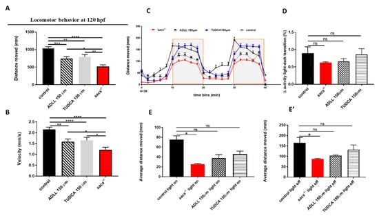In the absence of FDA-approved medications for the treatment of degenerative ataxia [], there are few options available to counteract the progressive degeneration of PC functions seen in ARSACS and similar clinical conditions []. Repurposing of FDA-approved drugs likely acting on multiple molecular targets seems a good avenue to explore at a preclinical level. In a pilot trial, we explored the feasibility of using sacs−/− larvae in drug screening, focusing on two potential targets. It has been speculated that stimulation of intracellular glutamate metabolism by branched-chain amino acids may improve neurotransmission among cerebellar neurons [] and that acetyl-DL-leucine (ADLL, Tanganil™), a branched-chain amino acid used to treat the symptoms of acute vertigo, might have a positive effect on ataxic symptoms in cerebellar disorders, moreover with a low risk/benefit ratio, given the electrophysiological similarities and close interactions between vestibular and cerebellar neurons []. Interestingly, in open-label studies in other forms of inherited ataxia, ADLL has already been suggested to be efficacious [], and it is also the subject of an on-going randomized controlled phase III trial []; however, it has never been tested in ARSACS. Similarly, TUDCA, a bile acid derivative with demonstrated beneficial neuroprotective effects in mouse models of neurodegeneration, including Parkinson’s disease [], Huntington’s disease, and amyotrophic lateral sclerosis [], appears to be of benefit in inherited ataxias []. TUDCA likely acts through attenuation of endoplasmic reticulum (ER) stress-induced apoptosis, and by counteracting the unfolded protein response and it is now entering a phase III clinical trial as an add-on therapy for ALS. Furthermore, it is worth noting that treatment with TUDCA also exerted a phenotype reversal in worm models of MJD/SCA3 (personal communication to FMS), a common form of dominant ataxia, and ameliorates proinflammatory polarization of microglia in vitro in multiple sclerosis in a dose-dependent manner []. TUDCA, too, has not been tested in ARSACS (either in patients or in mouse models). In view of this background, we investigated the potential of ADLL/Tanganil™ and TUDCA to counteract the phenotypes observed in sacs−/− larvae. For each substance, 4 hpf embryos through to 120 hpf larvae were exposed to five different concentrations in the range of 0.5 to 150 µM. We calculated the percentage of mortality at 30 hpf and assessed morphological alterations. Thereafter, the highest dose (150 µM) of each compound was used in the following experiments. We treated WT larvae at 120 hpf with both drugs and performed video tracking to measure the distance moved and velocity. The analysis did not show significant alteration or change in locomotor activity in each group of control larvae treated (Figure S2A), confirming the safety dose of these compounds. Then, we observed that 150 µM of ADLL/Tanganil™ or TUDCA could rescue, at least in part, the locomotor impairment seen in 120 hpf sacs−/− mutants, improving motor activity by 30% (Figure 4A,B). In addition, to evaluate the neuroactive properties of the substances tested, we exposed larvae at 120 hpf to an alternating light-dark locomotion test. This revealed changes in locomotor activity (Figure 4C,D) as described by others []. Although the data were not statistically significant, sacs−/−-treated larvae showed, on average, a tendency to an improvement in locomotor activity throughout the light/dark period (Figure 4E,E’).