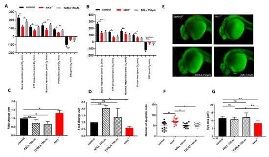 ADLL and TUDCA restore gene expression profile and prevent apoptosis in sacs−/− larvae. (A,B) Mitochondrial respiratory analysis after drug treatments. For each experiment, we compared treated sacs−/− larvae (n = 18) and untreated sacs−/− larvae (n = 18) and control (n = 18) at 120 hpf. * p ≤ 0.05, ** p ≤ 0.01, calculated by the non-parametric Kruskal-Wallis test. (C,D) qRT-PCR analysis on sacs−/− larvae after drug treatments. Three independent RNA samples from each group (controls, untreated sacs−/− and treated sacs−/−) were evaluated. * p ≤ 0.05, ** p ≤ 0.01, calculated by Dunnett’s multiple comparisons test. Abbreviation: ns, not significant (E) Detection of dying cells by acridine orange staining of 24 hpf sacs−/− embryos after drug treatments. The total number of embryos used per group tested (controls, untreated sacs−/− and treated sacs−/−) was 15. (F) Apoptotic cells were counted in the area defined by the red circle. Quantitative analysis of apoptotic cells. * p ≤ 0.05; ** p ≤ 0.01, calculated by the non-parametric Kruskal-Wallis test. The values are expressed as mean ± standard deviation. (G) Evaluation of the eye area of sacs−/− after drug treatments (controls, untreated sacs−/− and treated sacs−/−). * p ≤ 0.05, ** p ≤ 0.01, calculated by the non-parametric Kruskal-Wallis test. The values are expressed as mean ± standard deviation. Abbreviations: n, total number of evaluated embryos; error bars indicate standard errors of the means; ns, not significant.