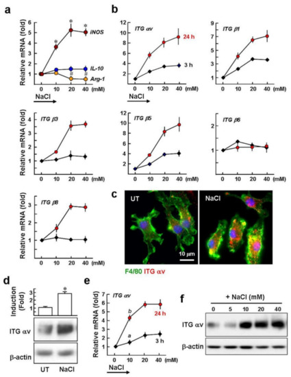 Exposure of macrophages to high salt medium induces expression of iNOS and αv integrins. BMDMs were cultured in isomolar medium (312 mOsm) and switched to hyperosmotic media (343~435 mOsm) by the addition of 10~40 mM NaCl. (a) qPCR analysis of the expression of macrophage M1- and M2-associated markers at 24 h. * p < 0.0001, # p < 0.02 versus untreated control (cells cultured in isomolar medium). (b) qPCR analysis of integrin gene expression at 3 h and 24 h. Data were normalized to gapdh expression levels and are summarized as mean ± SE of three separate experiments. After20 mM NaCl treatment for 24 h, the expression of αv integrin was monitored by immunofluorescence staining (c) and Western blot analysis (d). F4/80: a macrophage marker. Nuclei were stained with Hoechst 33258 (blue). Representative images, Western blots, and densitometric analysis are shown from three independent experiments. * p < 0.001 versus untreated BMDMs. (e) High salt effect on the αv integrin mRNA expression in THP-1 macrophages. Data were obtained from three independent experiments. a p < 0.02, b p < 0.006 versus untreated cells. (f) Western blot analysis of αv integrin expression in THP-1 after NaCl treatment for 24 h. Representative blots are shown from three independent experiments with similar results.