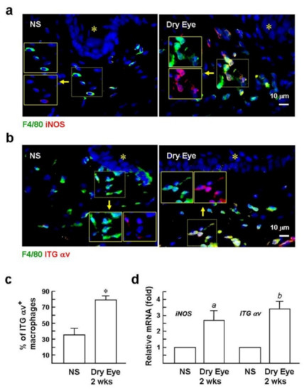 Expression of αv integrin is induced in macrophages in the dry eye. (a,b) Immunofluorescence staining of iNOS, αv integrin, and F4/80 (green; a macrophage marker) in conjunctiva at day 12 after DED induction. Insets are the images before superimposition. Nuclear counterstaining was conducted using Hoechst 33258 (blue). Asterisks indicate conjunctival epithelium. Representative images are from six sections per mouse eye with six mice per group. NS group: mice housed in a stress-free environment. (c) Digital image analysis of the percentages ofαv integrin+ macrophages per total macrophages was performed blindly on an average of six randomly selected × 1000 magnification fields from each section (n = 6) using a Zeiss epifluorescence microscope and Zeiss software. * p < 0.0001 versus NS group. (d) qPCR evaluates the levels of iNOS and αv integrin in the conjunctiva after DED induction for 12 days. Values are expressed as mean ± SE. a p < 0.03 versus NS mice. b p < 0.002 versus NS mice.