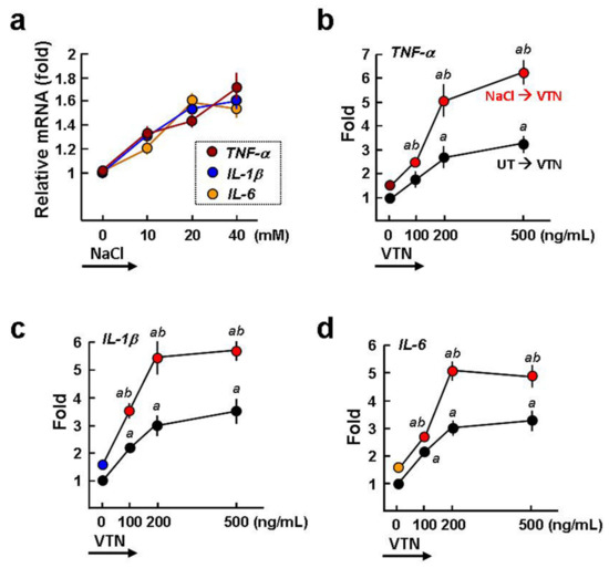 BMDMs responding to NaCl (20 mM or higher) stimulation have been found to have increased expression of proinflammatory cytokines [4,5]. Our qPCR assay confirmed these findings (~1.5-fold increased, p < 0.05; Figure 3a). In addition to NaCl stimulation, VTN (100~500 ng/mL) treatment for 3 h was also able to induce the gene expression of TNF-α, IL-1β, and IL-6up to 1.5~3-fold, compared to untreated BMDMs (a p < 0.05; Figure 3b–d), suggesting that VTN is a proinflammatory stimulator of the macrophages. Importantly, the VTN (100~500 ng/mL)-induced TNF-α, IL-1β, and IL-6 expression was further elevated to 2.3~6.2, 3.5~5.7, and 2.4~4.9-fold when the BMDMs were treated with 20 mM NaCl for 24 h. These results imply that the high salt-induced M1 macrophages are more susceptible to VTN-induced proinflammatory responses than the resting macrophages.