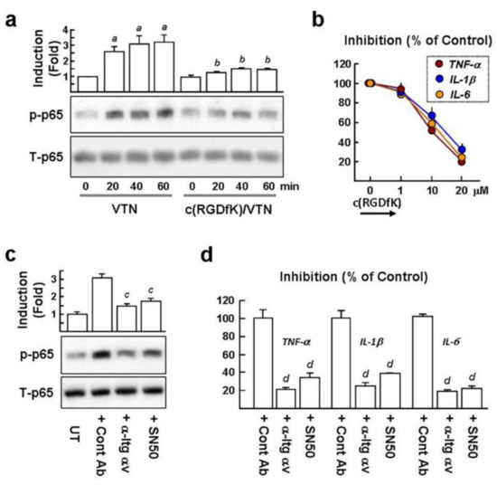 The transcription factor NF-kB is required for the maximal transcription of the TNF-α, IL-1β, and IL-6genes [18]. In the canonical NF-κB signaling pathway, NF-κB p65 subunit phosphorylation at Ser-536 (p-p65) is a critical event for the activation of NF-κB in the macrophages [19]. After observing the proinflammatory cytokine genes prominently induced in the VTN/NaCl-treated BMDMs, we investigated whether VTN can induce p65 phosphorylation (p-p65) in the NaCl-treated BMDMs. Western blot analysis revealed that VTN treatment for 20~60 min resulted in a 2.6~3.2-fold greater amount of p-p65 than the in untreated control (Figure 6a). Moreover, c(RGDfK) significantly blocked VTN-induced p-p65 to near baseline levels. qPCR analysis also revealed that VTN-induced TNF-α, IL-1β, and IL-6 gene expression (set as 100%) decreased by 50.8%, 65.5%, and 59.2%, respectively, when cells were pretreated with 10 µM c(RGDfK) (Figure 6b). In cells pretreated with 20 µM c(RGDfK), these further decreased to 20.2%, 31.3%, and 23.1%, respectively. In addition, VTN-induced p-p65 was considerably suppressed by the αv integrin blocking antibody and SN50 (an inhibitory peptide of NF-κB) compared to cells pretreated with IgG control (2.1-fold and 1.8-fold; Figure 6c). The αv integrin blocking antibody and SN50 also effectively suppressed the VTN-induced TNF-α, IL-1β, and IL-6 gene expression by 21~25% and 22~39%, compared to cells pretreated with the IgG control (Figure 6d). Collectively, the results indicate that NF-κB activation is critical for proinflammatory gene expression induced by VTN/αv integrins.