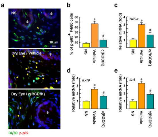 c(RGDfK) suppresses inflammatory responses in dry eyes. The mice received DED induction and c(RGDfK) treatment as described in the legend of Figure 5A. (a,b) Representative images of immunofluorescence staining of NF-κB p-p65 (Ser536) and F4/80 in the conjunctiva after DED induction for 12 days. The p-p65 located in the cell nucleus is confirmed by Hoechst 33258 counterstaining. Asterisks indicate conjunctival epithelium. Arrows indicate p-p65 and F4/80 double-positive cells. There were 30 randomly selected fields in each treatment (n = 6 per group) that were photographed, and the percentage of p-p65 and F4/80 double-positive cells per total F4/80-positive cells was calculated. * p < 0.0006 versus NS mice. # p < 0.0001 versus vehicle group. (c–e) qPCR evaluation of the mRNA levels of proinflammatory cytokines in the conjunctiva after DED induction for 12 days. Values are expressed as mean ± SE. * p < 0.001 versus NS mice. # p < 0.02 versus the vehicle-treated group.