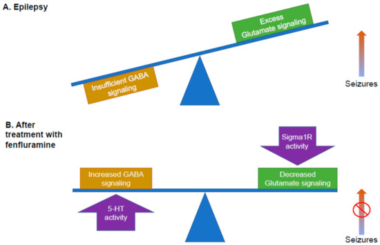 Potential mechanism of fenfluramine. Epilepsy is thought to generate an imbalance between inhibitory GABA signaling and excitatory glutamatergic signaling, leading to seizures. In the above figures, the balance between inhibitory and excitatory signaling is indicated by the blue balance beam. (A) Too much glutamate signaling results in seizures (e.g., the right arm of the balance beam moves upward). (B) Balance between inhibition and excitation is restored by the dual activities of fenfluramine: the activity of fenfluramine at 5-HT receptors results in increased GABA signaling, boosting inhibition, while the activity of fenfluramine at the Sigma1R reduces glutamatergic signaling, decreasing excitation. This mechanism is consistent with much, but not all, of the published research and is presented as a working model. 5-HT, serotonin; GABA, gamma aminobutyric acid; Sigma1R, Sigma1 receptor.
