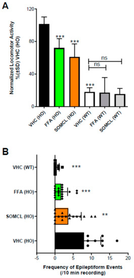 Activity profile of SOMCL-668 (SOMCL, 10 µM) and fenfluramine (FFA, 25 µM) in 7 dpf zebrafish larvae. (A) Treatment with SOMCL or FFA decreases the locomotor activity of 7 dpf scn1Lab−/− mutants (HO), but not wildtype (WT). Locomotor activity was normalized against VHC-treated scn1Lab−/− mutant larvae and is displayed as percentage ± SD. N = 30 to 60 zebrafish larvae for all experimental conditions. (B) Treatment with SOMCL and FFA reduces the epileptiform brain activity of 7 dpf scn1Lab−/− mutants (HO). The bars represent the numbers of epileptiform events (during 10 min of recording; ± SD) of homozygous scn1Lab−/− mutants (HO) or wildtype scn1Lab+/+ (WT) treated with vehicle (VHC) or SOMCL or FFA, compared to the outcome observed in VHC-treated homozygous scn1a mutants, vehicle control (VHC [HO]). N = 9 to 18 zebrafish larvae for all experimental conditions. Overall, statistical significance is represented by asterisks: ** p < 0.01, and *** p < 0.001 vs. VHC (HO). “No statistical difference” is left blank or is shown by “ns”. Statistical analyses: GraphPad Prism 5 software (GraphPad Software, Inc., San Diego, CA, USA) was used for statistical analyses. (A) Locomotor activity was analyzed by one-way ANOVA and subsequent Dunnett’s multiple comparison tests, as described in Sourbron 2016 and 2017 [23,30]. (B) Electrographic brain activity was analyzed by Mann-Whitney U tests, as was described in Sourbron 2016 and 2017 [23,30].