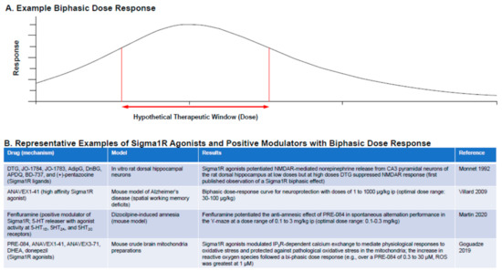 Biphasic dose response is a characteristic of many Sigma1R ligands. (A) Example dose–response curve showing therapeutic window for a response. (B) Representative examples of Sigma1R agonists and positive modulators following biphasic dose response [22,96,97,98,99].