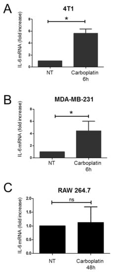 Firstly, we investigated the effect of carboplatin on the expression of the pro-inflammatory cytokine IL-6 in TNBC cells from mouse (4T1 cells) and human (MDA-MB-231) origin. The 4T1 cells and MDA-MB-231 cells were exposed to a subtoxic concentration of carboplatin for 6 h (Supplementary Figure S1). We found that carboplatin induces an increase in IL-6 at the mRNA level in TNBC cells. A significant augmentation of the level of IL-6 mRNA was found in 4T1 cells after 6 h of treatment with carboplatin (Figure 1A). Similarly, we found that carboplatin induces the expression of IL-6 in MDA-MB-231 cells after 6 h of treatment (Figure 1B). Exposure of RAW 264.7 cells to a subtoxic concentration of carboplatin showed no significant changes in IL-6 mRNA levels, neither after 48 h of treatment (Figure 1C), nor at 6 h and 24 h (data not shown).