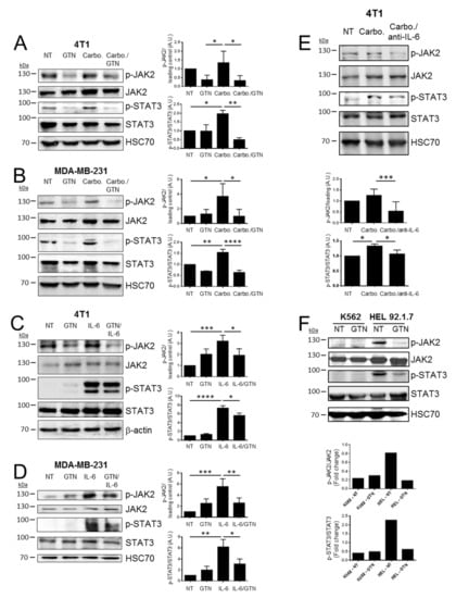 GTN inhibits IL-6-mediated JAK2/STAT3 signaling in TNBC cells. (A) 4 T1 cells and (B) MDA-MB-231 cells were treated with glyceryl trinitrate (GTN, 250 µM) and/or carboplatin (10 µM for 4T1 cells, 750 nM for MDA-MB-231 cells) or left untreated (non-treated, NT) for 48 h. (C) 4T1 cells and (D) MDA-MB-231 cells were treated with GTN (250 µM), recombinant murine or human IL-6 (rec-IL-6, 10 ng/mL), rec-IL-6/GTN or left untreated (non-treated, NT) for 6 h and 24 h respectively. (E) 4T1 cells were treated with carboplatin in presence or absence of neutralizing IL-6 antibody (anti-IL-6), or left untreated (non-treated, NT). (F) K562 and HEL 92.1.7 were treated with GTN 250 µM for 48 h. (A–F) The levels of phosphorylated JAK2 (p-JAK2), total JAK2, phosphorylated STAT3 (p-STAT3) and total STAT3 were analyzed by Western blot. HSC70 or β-actin was used as a loading control in all Western blots performed. The blots presented are representative of at least three independent experiments. (A–E) The histograms present quantification using densitometric analyses of at least three independent experiments: mean ratio p-JAK2/loading control (p-JAK2 normalized to the loading control either HSC70 or β-actin due to non-specific increase in JAK2 basal levels in 4T1 cells in response to treatment) and mean ratio p-STAT3/STAT3. (F) The histograms present quantification of one representative experiment (from three independent experiments). Statistically significant differences were determined using a one-way ANOVA test (with a Fisher’s LSD test). * p < 0.05; ** p < 0.01; *** p < 0.0001; **** p < 0.00001. (E) Statistical analysis for ratio p-STAT3/STAT3: * p < 0.1.