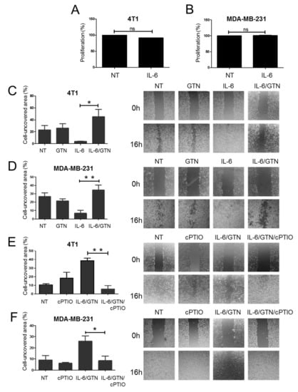 IL-6 plays an important role as a migration factor in vitro and in vivo. Wound healing assays were performed with recombinant IL-6 added to TNBC cells. To completely preclude any stimulation of cell proliferation by IL-6, we performed an MTS assay. We demonstrated that IL-6, upon 24 h of treatment, induced no modification in the rate of proliferation of TNBC cells (Figure 4A,B). We found that recombinant IL-6 increases the wound healing ability of both 4T1 and MDA-MB-231 cells (Figure 4C,D). We explored the effect of GTN on the ability of IL-6 to stimulate wound healing in TNBC cells. The wound healing activity of TNBC cells remains unchanged following treatment with GTN alone in comparison with non-treated (NT) control cells. However, combined treatment of IL-6 with GTN inhibits the wound healing activity of both 4T1 and MDA-MB-231 cells (Figure 4C,D). To confirm the role of NO in the inhibition of the wound healing by the NO donor GTN, cells stimulated with IL-6 along with GTN were treated in presence or absence of the NO scavenger cPTIO. We showed that in presence of cPTIO, the inhibitory effect of GTN on IL-6-mediated wound healing is abrogated in both 4T1 and MDA-MB-231 cells (Figure 4E,F).