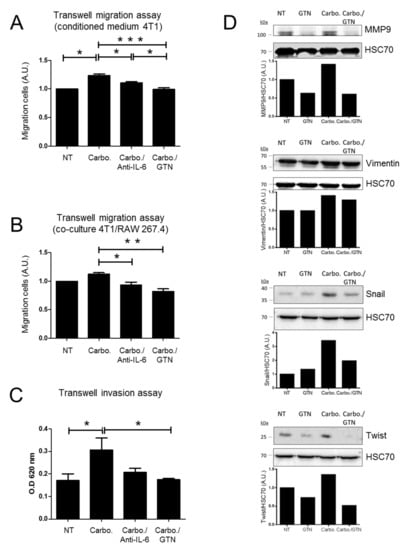 To further address cell migration, we explored the impact of GTN on TNBC cells using the transwell cell migration assay. The 4T1 cells were seeded in the upper compartment and conditioned medium from carboplatin-treated 4T1 cells was incubated in the lower compartment. To figure out whether IL-6 secreted from carboplatin-treated cells could promote 4T1 cell migration, an IL-6 neutralizing antibody was added to the conditioned medium in the lower compartment. We found significant effect of the IL-6 neutralizing antibody on carboplatin-mediated 4T1 migration activity. Moreover, the addition of GTN into the conditioned medium significantly abrogated carboplatin-mediated 4T1 migration activity (Figure 5A). We then performed a co-culture experiment using the transwell migration system. The 4T1 cells were seeded in the upper compartment while co-cultured 4T1 and RAW 264.7 cells (ratio 3:1) were seeded in the lower compartment and stimulated with the indicated treatment. The percentage of 4T1 cells migrating is more important in the presence of co-cultured 4T1/RAW 264.7 cells compared to 4T1 cells alone (data not shown). Carboplatin treatment slightly increases 4T1 cell migration. The addition of an IL-6 neutralizing antibody along with carboplatin treatment significantly affected 4T1 cell migration, and even more following GTN treatment (Figure 5B). The transwell cell invasion assays were performed with conditioned media from carboplatin-treated 4T1 cells, then treated without or with an IL-6-neutralizing antibody (lower chamber) or GTN (upper-chamber). We observed a significant increase in 4T1 cell invasion in the presence of conditioned media from carboplatin-treated 4T1 cells. Cell invasion in response to GTN was significantly reduced. In the presence of the IL-6-neutralizing antibody, there seemed to be a trend that approximated but did not reach statistical significance (Figure 5C). We investigated the role of GTN on the EMT process. The EMT was stimulated by TGF-β1 in 4T1 cells attested by the upregulation of mesenchymal markers [27]. We found that TGF-β1-induced EMT in 4T1 cells increased the level of expression of the mesenchymal markers MMP9, Vimentin, Snail and Twist, and to a further extent upon carboplatin exposure. However, in response to GTN, the level of the mesenchymal markers was reduced (Figure 5D).