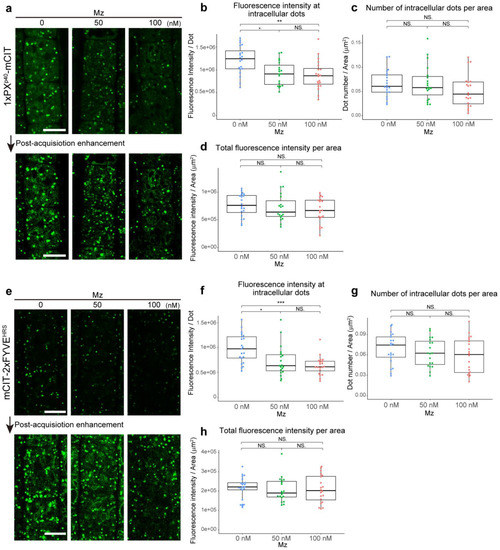 Quantification of the fluorescence intensity was performed by ImageJ. For the PM, the outline of the cell was drawn outside of the PM by hand, and the signal intensity was quantified in the region that is within 1.5 µm inside the outline, which was subsequently normalized by the area. For the intracellular dots, mask images were created by applying the threshold, and those masks were used to extract the dots from the original images. The total signal intensity was normalized by the number of the dots. The threshold was kept constant for all the samples that are shown in the same graph. In order to avoid including a non-dotty background, only the structures with circularity over 0.1 were quantified (circularity is defined as 4πA/P2 with A = area and P = perimeter, and it takes the values 0.0–1.0 with 1.0 representing the perfect circle).