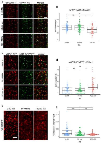 Next, we checked whether the co-localization degree between PI3P-labeled compartments and either the TGN or MVBs was altered upon metazachlor. To this end, given that PI3P was described to mainly localize at MVBs and sparsely at the EE/TGN compartment, we performed co-localization analyses between PI3P-labeled compartments and either the MVB marker RAB-G3f fused to mCHERRY or the TGN marker VHA-a1 fused to mRFP [29,30]. While it was shown that 1xPXP40-mCIT and mCIT-2xFYVEHRS reside both mostly at MVBs and weakly at the TGN, it was also described that 1xPXP40-mCIT additionally labels the vacuoles, resulting in greater dilution of this biosensor over the intracellular membranes [26]. Thus, we used mCIT-2xFYVEHRS for co-localization analysis with the TGN but were unsuccessful in getting the mCIT-2xFYVEHRS biosensor crossed line with the MVB marker RAB-G3f fused to mCHERRY during the course of this study. Instead, we used the 1xPXP40-mCIT biosensor for co-localization analysis with MVBs. As a consequence, the co-localization degree of PI3P biosensors with the TGN or MVBs is not directly comparable. Nonetheless, our results revealed a significant decrease of PI3P-positive compartments co-localization with MVBs and a significant increase of co-localization with VHA-a1-positive sub-domain of the TGN when the root cells were treated with metazachlor (Figure 2a–d).