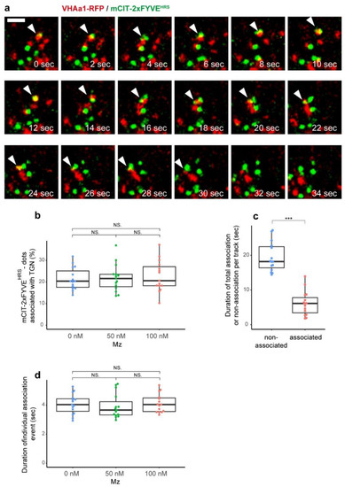 TGN and MVBs transiently associate together but VLCFAs are not involved in this process. (a) Representative example of a confocal Airyscan sequence of an association event in root epidermal cells expressing the TGN marker VHA-a1-mRFP (red dots) and the PI3P mCIT-2xFYVEHRS-labeled structures (green dots) in control condition. Associations (as between 2 and 10 s) as well as some co-localizations (as at 12 s) are observed. The white arrowheads indicate the association events. Sometimes, several PI3P-positive structures associate with one TGN, like at 22 s. Eventually, the compartments dissociate. (b) Quantification of the number of PI3P-positive structures that associate with TGN at one-time point; no significant differences were observed between control condition (0 nM), upon 50 nM metazachlor (Mz) or upon 100 nM Mz. (c) Quantification of the duration (in seconds) of the tracking of either non TGN-associated (average time of 19 s) or TGN-associated PI3P-positive structures (average time of 6 s). (d) The duration time of the TGN-associated PI3P-positive structure was not modified upon 50 nM Mz or upon 100 nM Mz. n = 15 roots for each condition. Statistics were done by two-sided Dwass–Steel-Critchlow-Flinger multiple comparison test with Monte Carlo method (10,000 iterations). *** p < 0.005; NS: non-significant. Scale bar, 2 µm.