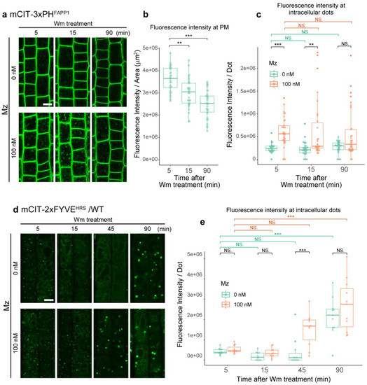 The fungal metabolite wortmannin is an inhibitor of the phosphatidylinositol 3-kinase (PI3K) complex that produces PI3P at MVBs [33,34]. In Arabidopsis roots, wortmannin causes homotypic fusion of MVBs resulting in typical donut-shaped MVBs agglomeration [31,34,35]. Wortmannin inhibits PI3K at 1 µM while it inhibits both PI3K and PI4K at 33 µM [33,36,37]. While the use of 1 µM wortmannin would be more specific to PI3P, it has been shown previously that this concentration does not have any effect on the morphology, mobility or distribution of the PI3P-positive MVBs [34]. Thus, we chose to work with 33 µM wortmannin and first checked the PI4P localization pattern upon wortmannin. In the control seedlings, the PI4P biosensor mCIT-3xPHFAPP1, was mainly localized at the PM and weakly in intracellular dots after 5 min of wortmannin treatment (5 min, Figure 4a). While the intensity of the mCIT-3xPHFAPP1 at the PM decreased already after 15 min of wortmannin treatment and became even more weaker at 90 min of treatment, the fluorescence intensity at intracellular dots was not modified even after 90 min treatment (Figure 4b,c). We previously found that metazachlor treatment causes the accumulation of PI4P at TGN [38], this accumulation was not modified by additional wortmannin treatment (Figure 4c). These results show that wortmannin impacts PI4P quantity at the PM but not at intracellular compartments.