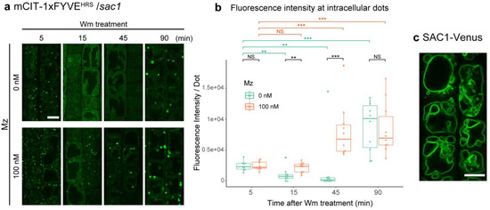 SAC1 is not involved in VLCFA-mediated PI3P homeostasis at TGN and MVBs. (a) sac1 mutant root epidermal cells displaying PI3P intracellular structures (green dots)labeled by the mCIT-1xFYVEHRS biosensor during Wm treatment (5, 15 and 90 min) of seedlings grown on 0 or 100 nM Mz-containing medium. (b) Quantification of the fluorescence intensity at intracellular dots showing significant differences between 5, 15 and 45 min and high increase at 90 min of Wm treatment in control seedlings and high increase already after 45 min of Wm upon Mz treatment. (c) Intracellular localization of SAC1-Venus displaying localization at vacuoles. n = more than 10 roots for each condition. Statistics were done by two-sided Dwass–Steel–Critchlow–Flinger multiple comparison test with Monte Carlo method (10,000 iterations) for comparing between different timepoints, and two-sided Wilcoxson’s rank-sum test for comparing between different Mz treatments. ** p < 0.01, *** p < 0.005; NS: non-significant. Scale bars, 10 µm.