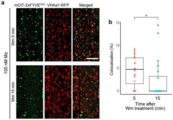 PI3P might be transferable from TGN to MVBs. (a) Root epidermal cells expressing the TGN marker VHA-a1-mRFP (red dots) and the PI3P mCIT-2xFYVEHRS-labeled structures (green dots) in wild-type seedlings grown on 100 nM metazachlor (Mz) during wortmannin (Wm) treatment (5 and 15 min). (b) Quantification of the co-localization level between PI3P biosensor and the TGN showing a decrease of PI3P at TGN between 5 and 15 min of Wm treatment in Mz-grown seedlings. n = 20 roots for each condition. Statistics were done by two-sided Wilcoxson’s rank-sum test. * p < 0.05. Scale bar, 10 µm.