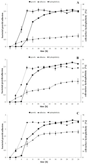 Bacteria were stored as frozen stocks in the presence of DMSO (−80 °C). The colonies grown on an agar nutrient plate with 0.1% phenol (swarming growth inhibitor) were used to inoculate Tryptic Soy Broth (TSB, BioMaxima S.A., Lublin, Poland) medium in 100 mL Erlenmeyer flasks. The cultivation was carried out at 37 °C with shaking at 105 rpm for 24 h. Planktonic cells were collected every 2 h (for growth, adhesion and hydrophobicity studies) and after 6 and 24 h incubations (for lipidomic and fluorescent studies).