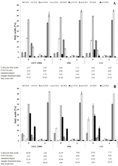The present study was designed to compare the fatty acids profiles for adherent and planktonic cells of the P. mirabilis strains in search of FAs related to the phenomenon of cell adherence to a catheter surface. The adherent (A) and the planktonic (P) cells were different (p ≤ 0.01) in terms of their FA composition, however the distribution of fatty acids between the outer and the inner membranes was not determined. First of all, the A cells had higher contents of cis C18:1 and C18:0 as well as lower levels of cis C16:1, C16:0 and cy 19:0 than the P cells (Figure 2). Moreover, adherent cells were characterized by less content of acyclic fatty acids and longer, more unsaturated and less branched fatty acids than planktonic cells.