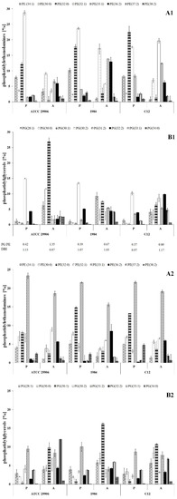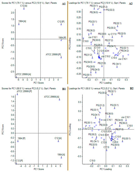 In order to confirm the main differences in the profiles of phospholipids and fatty acids incorporated in the planktonic and the adherent cells of the P. mirabilis strains, a principal component analysis (PCA) was applied. The matrix loadings were orthogonally rotated, and the first four principal components were retained based on the examination of the scree plot of the eigenvalues. In the PCA of the relative levels of FAs and PLs, the two principal components explained 79.1% and 10.9% of the overall variances for 6 h cells (Figure 4A1), as well as 88.8% and 5.2% of the overall variances for 24 h cells (Figure 4B1). The location of the P and the A cells in various halves of the coordinate system proved the differences in the planktonic and the adherent P. mirabilis cells in terms of cell composition (without division to lipids of the outer and the inner membrane). Firstly, PCA of the results from 6 h of incubation revealed that the cells of the P. mirabilis C12 and 1984 strains were similar in terms of lipid composition. The A cells of both strains were found in the first quarter, whereas the P cells of both strains were located in the second quarter. On the other hand, the P and A cells of the P. mirabilis ATCC 29906 strain were located separately, respectively in the third and in the fourth quarter, being completely distinct from the rest (Figure 4A1). A very similar distribution of the samples was obtained for the 24 h cells with the difference that the examined cells were relocated between different quarters (Figure 4B1). According to the results of the principal component analysis, the molecules whose levels separated the 6 h C12 and ATCC 29906 adherent cells (respectively as highly and weakly adherent strains) were PE 33:1, PE 36:0, PG 31:2, PG 33:1, PG 34:0, C13:0 and C15:0. The 24 h C12 and ATCC 29906 adherent cells were differentiated by the levels of PE 32:1, PG 30:0, PG 33:1 and C11:0. On the other hand, the lipids whose amounts distinguished the planktonic cells from the adherent cells of the P. mirabilis C12 (as the most adherent and hydrophobic strain) were PE 32:0, PE 33:1, PG 32:2, PG 33:1 and cy 17:0. The 24 h adherent and planktonic cells of the C12 strain were differentiated by the quantities of PE 34:1, PE 32:0, PE 38:2, PG 30:0, PG 30:1 and C15:0.