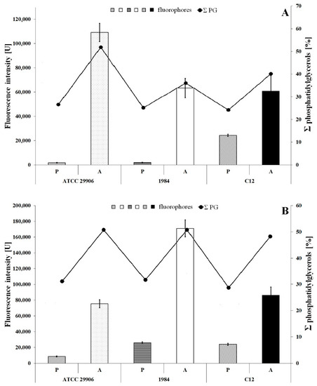 Fluorescence intensity of 6 h (A) and 24 h (B) planktonic and adherent cells of the P. mirabilis ATCC 29906, 1984 and C12 labeled with DiBAC4 (3) (a bar graph) and the summed content of phosphatidylglycerols in the tested bacterial cells (a line graph).