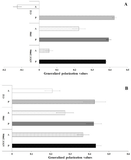 Membrane fluidity was investigated through generalized polarization (GP) measurements of the bacterial cells labeled with Laurdan. The results are shown in Figure 6. In general, the GP values for all samples were in the range from −0.12 to 0.43. Significantly lower Laurdan GP values (p ≤ 0.05) were reported for the P. mirabilis cells attached to the catheter surface than for its planktonic cells. These results indicated lower packing density of membrane components of the A cells compared to tightly packed membranes of the P cells. Comparing GP values obtained for the planktonic and the adherent cells, the greatest differences were observed for 6 h cells of the highly adherent and hydrophobic strain, which is P. mirabilis C12. Generalized polarization of Laurdan was estimated at 0.43 for the P cells and at −0.12 for the A cells.
