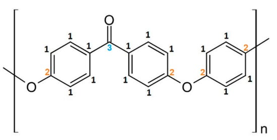 The chemical composition analysis of the PEEK samples modified in the presence of nitrogen and oxygen started from the analysis of the non-modified PEEK being the reference material. The non-modified PEEK‘s chemical structure is presented in Figure 3.