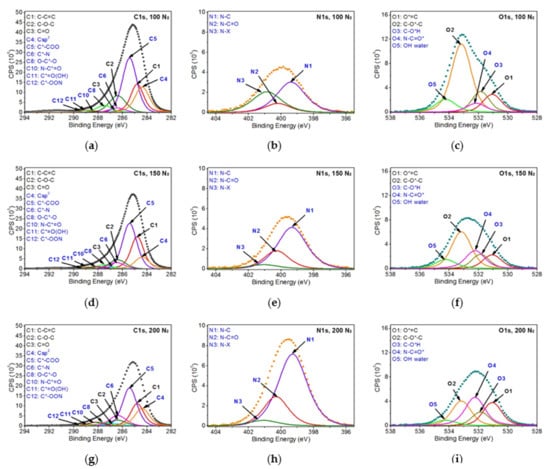 XPS spectra of PEEK modified with EUV radiation and nitrogen plasma: (a) C1s band—100 EUV pulses, (b) O1s band—100 EUV pulses, (c) N1s band—100 EUV pulses, (d) C1s band—150 EUV pulses, (e) O1s band—150 EUV pulses, (f) N1s band—150 EUV pulses, (g) C1s band—200 EUV pulses, (h) O1s band—200 EUV pulses, and (i) N1s band—200 pulses.