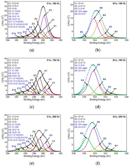 XPS spectra of PEEK modified with EUV radiation and oxygen plasma: (a) C1s band—100 EUV pulses, (b) O1s band—100 EUV pulses, (c) C1s band—150 EUV pulses, (d) O1s band—150 EUV pulses, (e) C1s band—200 EUV pulses, and (f) O1s band—200 EUV pulses.