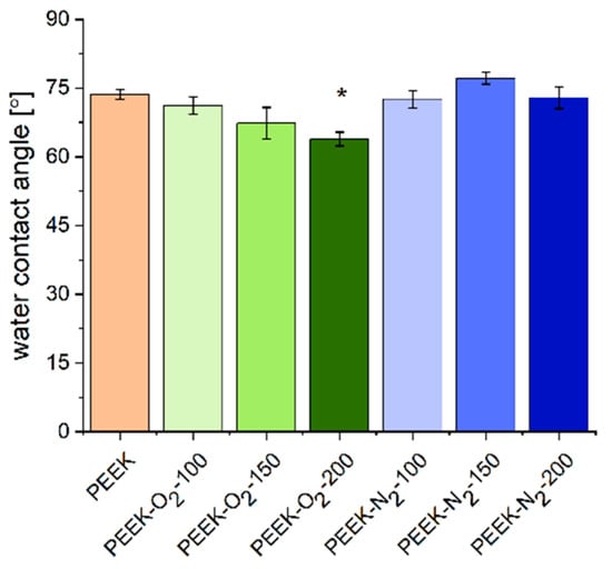 The water contact angle (WCA) measurement results are shown in Figure 7. The WCA of control material (PEEK) equaled to 74 ± 3°, which is closed to values reported by other authors for untreated PEEK [16,17,37,38]. The modification in the presence of oxygen slightly increased the wettability of the PEEK surface, the contact angle decreased with the increase of the number of EUV pulses and amounted to 71 ± 6°, 67 ± 10° and 64 ± 5° for PEEK-O2-100, PEEK-O2-150 and PEEK-O2-200, respectively. The value measured for PEEK-O2-200 was significantly lower (p < 0.05) compared to the control. Other authors also reported a decrease in WCA values for PEEK treated with plasma in the presence of oxygen [17]. PEEK modified using nitrogen gas did not show significant differences in WCA values compared to the control material. The WCA values were respectively: 73 ± 6°, 77 ± 4° and 73 ± 7° for PEEK-N2-100, PEEK-N2-150, and PEEK-N2-200. This may lead to the observation, that oxygen modification leads to a more polar behavior, hence better water wet-able surface. Data presented in the literature also show that the modification of PEEK under a nitrogen atmosphere mostly leads to an increase in surface hydrophilicity [16,38].