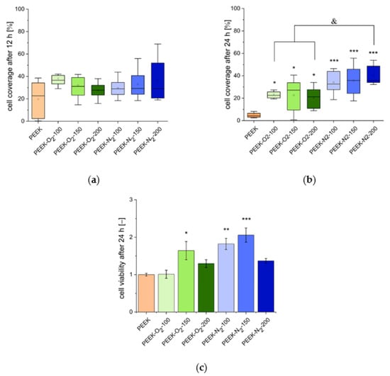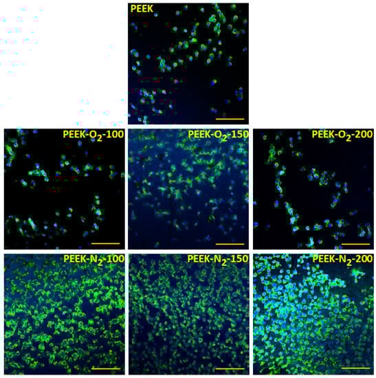 Cell viability performed after 24 h of culture (Figure 9c) revealed that all analyzed surfaces were not cytotoxic. All variants of the modified PEEK surfaces showed a similar or higher viability rate compared to the control surface. In most cases, for materials modified in a nitrogen atmosphere, cell viability was higher compared to the control and to the materials modified in an oxygen atmosphere, which is obviously related to the higher number of cells adhered to these surfaces.