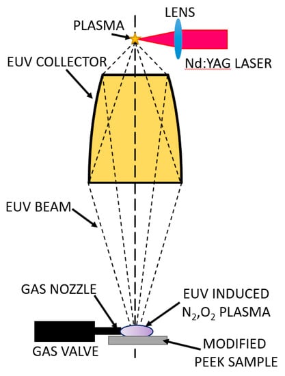 Scheme of the experimental arrangement for the modification of the PEEK surface with EUV radiation and nitrogen or oxygen plasma.