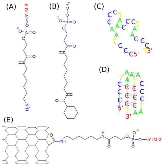 Essential components of the analyzed systems. (A) amino DNA linker composed of 5′ amino C6 linker (blue) and iM sequence (red); (B) template molecule of the amino C6 linker used for computation of atomic partial charges; (C) random coil of the DNA iM sequence at neutral pH; (D) iM sequence folded into i-motif structure at acidic pH; (E) on tip functionalized carbon nanotube by amino DNA linker with the iM sequence.