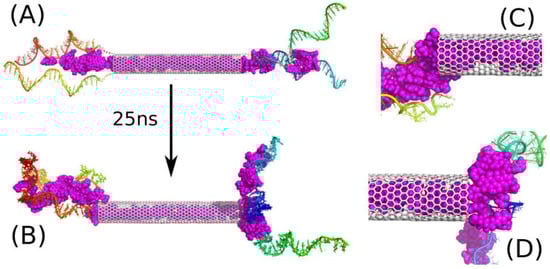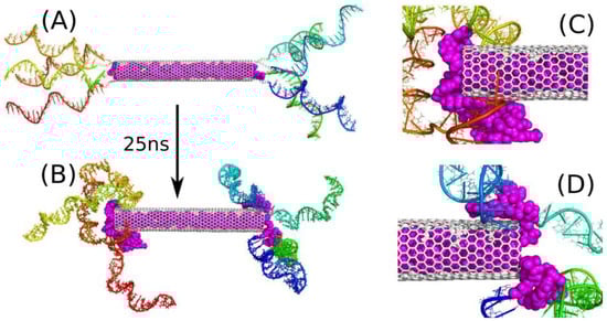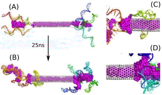 (A) Initial state of E2D40 system, i.e., with additional 20 DOX (magenta) molecules placed initially in the space between iM chains and with only two iM chains in each side; (B) the state of E2D40 system after 25 ns of simulations. (C,D) show zoomed-in areas around CNT tips.