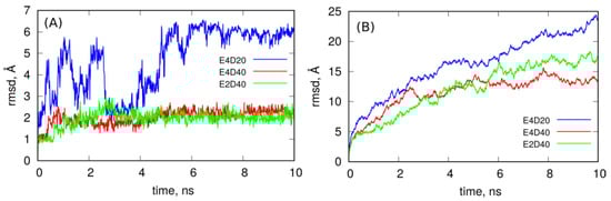 Figure 5 completes the conclusions drawn from observation of the MD trajectories by showing how spatial structures of these systems evolve in time. It shows the rmsd of DOX molecules encapsulated in the CNT interior (A) and rmsd of the whole systems (B) determined from the last 10 ns of simulations. As seen in Figure 5A, DOX molecules in the case of E4D20 system, i.e., when corks at the CNT ends have not formed yet, are mobile, and their rmsd fluctuates significantly. This means that DOX tries to escape from the nanotube since there is not much space left within the nanotube. The same analysis in the case of E2D40 and E4D40 systems leads to the conclusion that DOX molecules are almost immobilized in the CNT interior because rmsd is small and flat in both these cases. This effect appeared when other DOX molecules intercalated in iM chains and formed corks at the CNT ends. Thus, the systems E2D40 and E4D40 represent the states with DOX stably entrapped within the carrier structure. On the other hand the system E4D20 might be representative to the case when CNT tips are still open.