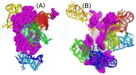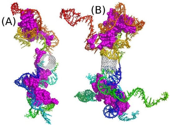 As seen in Figure 2B DOX molecules do not detach from the carrier, but are bound to iM fragments. The escape of more DOX from the CNT interior was found as a very slow process and it was rather impractical to continue calculations until more DOX molecules escape from the CNT and show their final localization within the carrier structure. As already mentioned the free energy barrier preventing DOX from the escape from (30.0) bare CNT was ca. 22 kJ mol−1 therefore the probability of observation of such an event in the narrower nanotube is very small within the applied simulation timescale. Taking into account the macroscopic timescale, a barrier of 20–50 kJ mol−1 means that the state is unstable at ambient temperatures and DOX molecules spontaneously escape from the CNT interior. Thus, the trapping of the released DOX molecules by flanking iM chains is a very important observation, since stabilization of iM fragments, when they form a mixture with DOX as found recently [], offers a promising strategy of DOX immobilization within the carrier structure. Therefore, we continued the analysis with a modified computational setup. That is, we started calculations from the same state as in Figure 2A, but additional 20 DOX molecules were incorporated into the space between the iM chains. Thus, we obtained the state shown in Figure 3A and continued calculations for 25 ns reaching the state shown in Figure 3B.