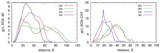 Figure 8 completes the discussion of interaction energies and structural factors by presenting radial distribution functions, g(r), for DOX—iM pairs and also for DOX-CNT pairs. As both pairs are many-atomic molecules, the distances are computed between center of mass of DOX (which is relatively small molecule) and individual atoms of the second component. Analysis of those functions gives insights into long-time behavior of the systems states. Thus, we can conclude that the switch between neutral form of the carrier and the acidic one is clearly visible in g(r) functions. The upper part of Figure 8 shows that in the systems I2N and I4N DOX reveals two density maxima: one at close contact with iM atoms and second at much larger distance. This is of course related to intercalation of DOX in two sides of the nanotube core within the iM bundles. In the case of I2A and I4A systems the positions of DOX molecules are more fuzzy and shifted to closer distances from iM atoms. This is of course related to unlocking of DOX from iM chains and localization of DOX close to the CNT core.