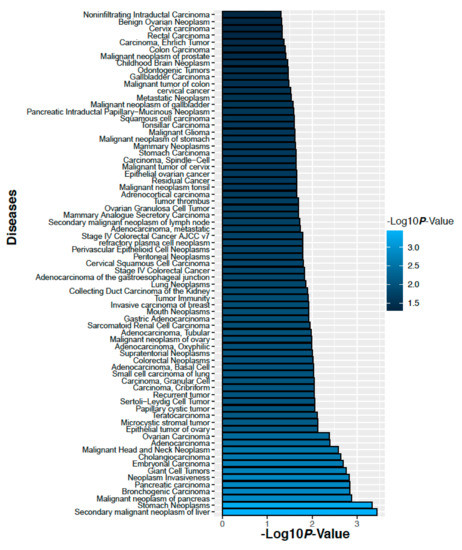 We have analyzed gene-disease association studies using the DisGeNET database that contains validated gene markers for each disease [22]. Carcinoma and neoplasm diseases associated with the genes corresponding to the altered 14 proteins in the ovarian cancer and their significance levels are shown in Figure 11. Similarly, carcinoma and neoplasm diseases associated with the genes corresponding to the altered 3 proteins in colorectal cancer and their significance level are shown in Figure 12. We observed that many cancers associated with our identified proteins.