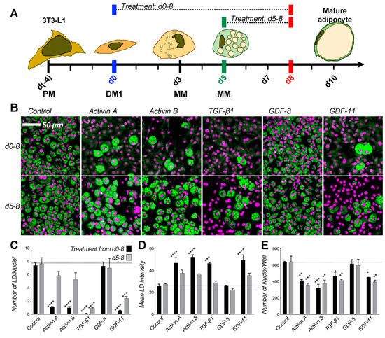 To identify steps controlled by TGF-β pathways in adipogenesis, we investigated the time-dependent effect of 11 different ligands on 3T3-L1 differentiation following a standard 3T3-L1 differentiation assay [41] (Figure 1A). We found that TGF-β-like ligands (i.e., TGF-βs, Activins, GDF-8 and GDF-11, which mainly activate SMAD2/3 pathways via the receptor kinases ALK4, ALK5, or ALK7 [42,43]), inhibited 3T3-L1 adipogenesis, as indicated by the near complete absence of lipid droplet (LD) formation in samples treated from the beginning of differentiation (day 0) until harvest (day 8) (Figure 1B,C). This effect was attenuated but still evident when cells were treated from later stages of differentiation (day 5) until harvest (day 8). Intriguingly, the few LDs that formed in treated samples appeared to be enlarged (Figure 1D), indicating that TGF-β-like ligands could promote hypertrophy of mature adipocytes. In addition, treated samples had fewer nuclei per well than untreated controls (Figure 1E), indicating that TGF-β-like ligands may limit proliferation, or reduce pre-adipocyte number through another mechanism. Although GDF-8 appeared to be an exception in this group, higher concentrations may be required due to its lower potency [44,45].