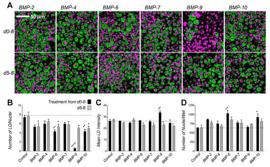 BMP-ligands induce 3T3-L1 proliferation. (A) 3T3-L1 cells were grown with 1 nM ligand as noted or vehicle control (PBS) from day 0 (top panel) or day 5 (bottom panel) of differentiation until day 8. Vehicle control is shown in Figure 1B. Cells were fixed at day 8 and stained for lipids using Nile red (green), nuclei were counter-stained with DAPI (magenta). Cells treated with various BMPs generally show increased number of nuclei and DAPI fluorescence. (B–D) Quantitative analysis of 3T3-L1 samples treated with ligands from day 0 (black) or day 5 (grey) of differentiation. Confocal images were analyzed using ImageJ and data were evaluated using Prism 9. Statistical significance from two biological replicates was calculated by two-way ANOVA and Dunnett’s multiple comparisons test (* p < 0.05; ** p < 0.01; **** p < 0.0001). (B) Total number of lipid droplets (LD) per well. (C) Mean lipid droplet intensity. (D) Number of nuclei per well.
