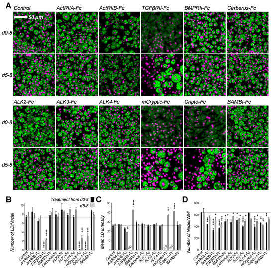 To discover compounds that modulate adipogenic fates by inhibiting TGF-β family ligands, we investigated how 11 Fc-fusion traps that inhibit different groups of TGF-β family ligands affect 3T3-L1 differentiation. Traps were based on the ligand binding domains of TGF-β family type I receptors (ALK2, ALK3, ALK4), type II receptors (ActRIIA, ActRIIB, TGFβRII, BMPRII), antagonists (Cerberus) and co-receptors (mCryptic, Cripto-1, BAMBI) (Figure 3). Their ligand binding activities are summarized in Table S2 [53,54,55,56,57]. Of the tested traps, TGFβRII-Fc, mCryptic-Fc, and Cripto-1-Fc profoundly suppressed adipocyte formation from precursors, as indicated by the near total absence of LDs in cells treated at the beginning of differentiation (Figure 3). Matching our ligands results, the few cells that differentiated in the presence of treatment had enlarged LDs (Figure 3C). In addition, inhibitory traps reduced the number of adipocytes, as treated samples had fewer nuclei per well (Figure 3B,D).